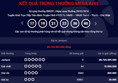 Ket qua xo so Vietlott hom nay trong kỳ quay số mở thưởng lần thứ 251 của Mega 6/45 vào hôm nay (ngày 28/2) cho thấy, không có người trúng giải đặc biệt (jackpot). Dãy số được xác định sau kỳ quay số là 17 – 19 – 21 – 23 – 36 – 40.